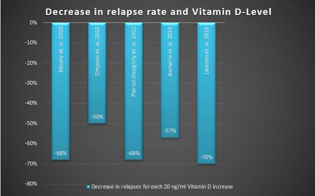 - Anhand einer Studie mit 1658 Teilnehmern fanden Forscher einen starken inversen Zusammenhang des Vitamin-D-Spiegels zum Risiko eine Demenz zu entwickeln heraus. Probanden mit Vitamin-D-Spiegeln von unter 10 ng/ml hatten ein um 122% höheres Risiko an Demenz zu erkranken als Probanden mit Spiegeln von über 20 ng/ml.