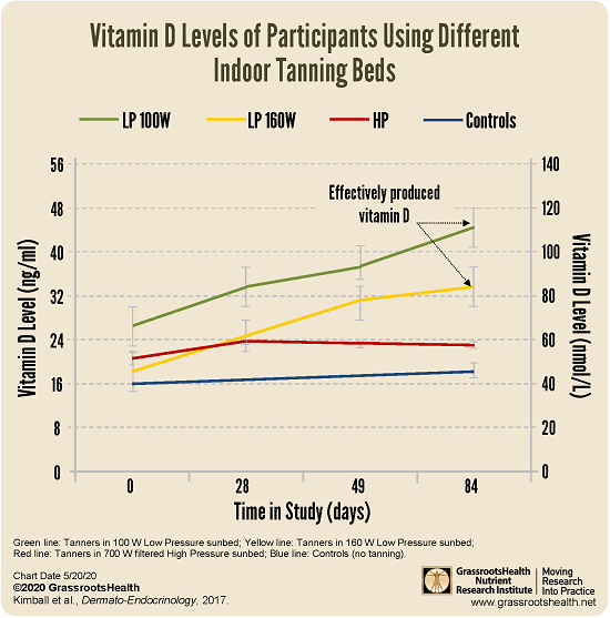 Eine aktuellere Studie der kanadischen Autoren Kimball, Lee und Vieth aus dem Jahr 2017 (3) zeigte ebenfalls, dass durch die Nutzung von Sonnenbänken angemessene Vitamin D-Spiegel erreicht werden können, sofern die Geräte über einen UV-B-Strahlungsanteil verfügen, der annähernd der Sommersonne im Freien entspricht. In dieser Studie wurden Sonnenbänke mit verschiedenen Leuchtmitteln und somit unterschiedlichem UV-B-Anteil berücksichtigt.