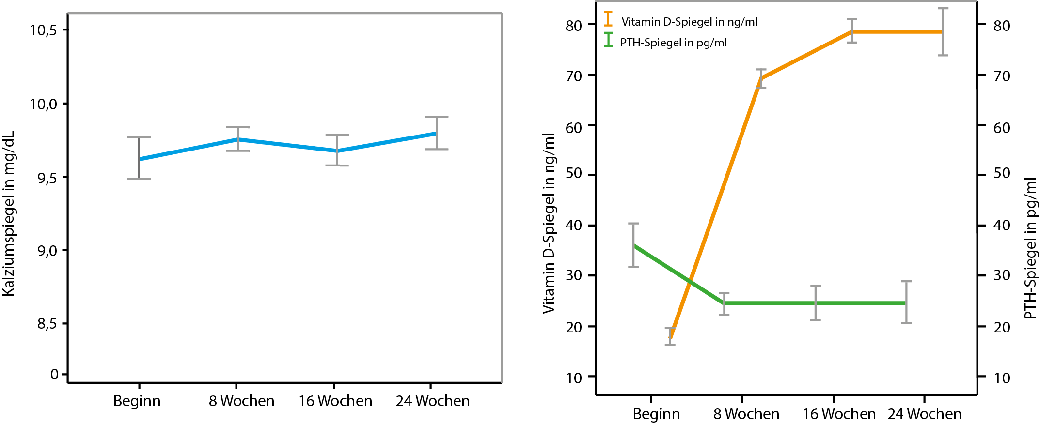 Abb. 5: Auf der linken Seite repräsentiert der Graph die Kalziumwerte im Serum bei einer Dosierung von 10.000 I.E./Tag über den Untersuchungszeitraum von 24 Wochen. Auf der rechten Seite sind der Vitamin D-Spiegel und der Parathormonverlauf aus dem gleichen Zeitraum abgebildet. Somit zeigt auch diese Untersuchung ganz deutlich, dass sich (innerhalb der angegebenen Grenzen) der Kalziumspiegel unabhängig von der Vitamin D-Zufuhr nicht signifikant verändert (nach Shirvani, A. et al., 2019).