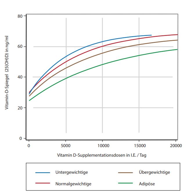 Die Untersuchungen von Ekawaru und seinen Kollegen aus dem Jahr 2014 illustrieren in einem Regressionsmodell, das aus Aufzeichungen von über 22.000 Teilnehmern errechnet wurde, die Dosis-Einnahme-Wirkung auf den Vitamin D-Spiegel. Eine vorbestimmte täglich zugeführte Vitamin D-Dosis wirkte sich, wie in Abb. 4 ersichtlich, in Abhängigkeit vom Körpergewicht unterschiedlich auf die Vitamin D-Spiegel der Probanden aus. Kurzum, wer mehr Kilos auf die Waage bringt, benötigt auch entsprechend mehr Vitamin D.